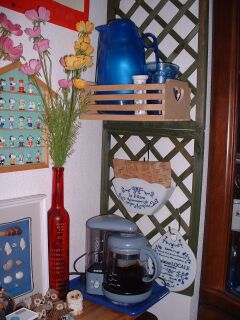 壁に100円ショップで買ったラティスを縦に3枚つなげて、100円ショップで買ったハートでくりぬかれたかごを結束バンドで取り付けて、コーヒーや紅茶に必要なグッズを入れたり、かけたりして収納しています。 |