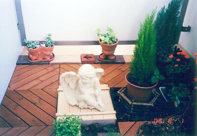 ガーデニングを始めた頃のベランダです。ウッドデッキ、オーストラリアレンガ(サンセット、ビショップ)を敷き詰め、植物もグリーンしかありません。 写真もこの頃はデジカメを持っていなかったので、スキャナで取り込んだものです。今のベランダから思うと、なんだかすっきりしています。