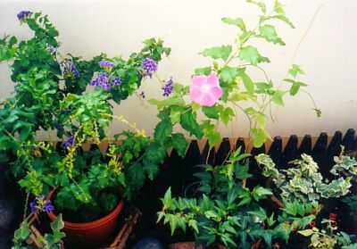 実家でも育てていたデュランタ宝塚は最初からどうしても欲しくて買いました。 100円ショップで買った焼き杉のブランターカバーに左から、アイビー:ニードルポイント、アイビー:ミントコリブリ、アイビー:ゴールデンジッタです。 朝顔は種から撒いてみました。この時は、まだ何色が咲くのか分かりませんでした。 後ろの木の柵はまだ途中までしかありません。蔓のかごはホルンのような形が気に入って買いました。