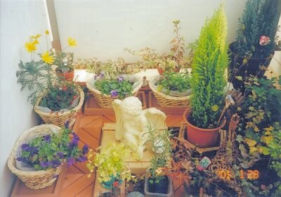 100円均一で買ったかごにチューリップ:ライラックレディの球根とビオラを植えました。楕円形が微妙にゆがんだ形で、白くて自然な感じのかごが気に入っています。 黄色のユリオプスデージーが色鮮やかでベランダを明るくしてくれます。天使が球根の行方を見守っているようです。 |