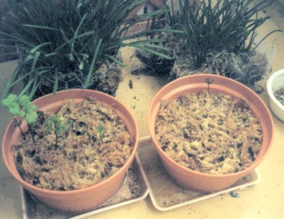 アネモネ:デカンスカーレット、アネモネ:デカンブルーの芽が出てきたところです。アネモネの球根はすぐに売っているときは乾燥しているので、一気に水を付けてしまうと腐ってしまいます。空のパターのケースに湿らせたキッチンペーパーの上に並べて、しばらく冷蔵庫の中に置いておきました。球根が十分に大きく膨らんでから植えつけました。 |