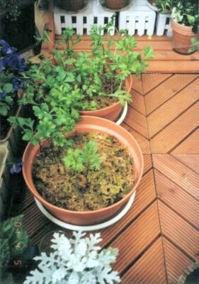 8重咲きムスカリ:ファンタジークリューションを玉ねぎのネットに水ゴケをまわりにしきつめて、真ん中に少し土を入れて球根を10個ほど入れて丸くしてみました。にょっきと芽が出てきたことろです。宙に浮いて芽が出ている所が面白いです。 |