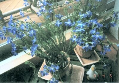 | オレンジ色の初恋草はすでにもっていたのですが、やっぱり青色の初恋草も欲しくなって1鉢買いました。でも、部屋の中に入れている間に、冬の暖房で弱って枯れてしまいました。その後、どうしても欲しくなり2鉢買いました。ちょうちょうが飛んでいるように次々に咲いていて、とても幻想的です。 |