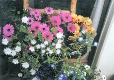 紫色のディモルフォセカとオレンジ色のディモルフォセカが満開です。ぱっと広げた花びらがひまわりのように元気いっぱいで、黒い花の芯がアクサントになっています。 その手前にあるのが白い花に紫の縁取りが入ったネモフィラ:マラクタと水色のネモフィラ:インシニグスです。いろんな方向に茎が伸びて、のびのびとしていて、5つの花びらがとてもかわいらしいです。 アイリスオーヤマからでている受け皿つきのワイヤーハンギングネットにポット苗のまま並べて、木の椅子にかけています。
